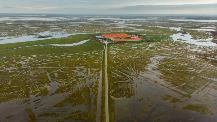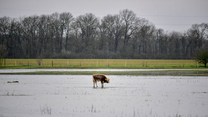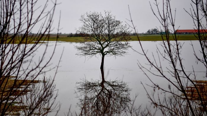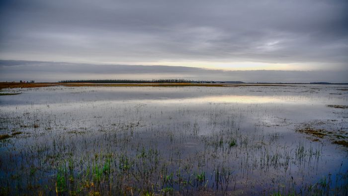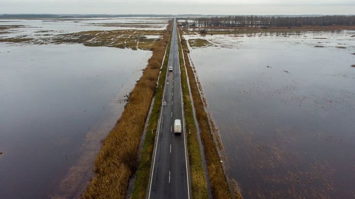 1/6Járművek haladnak a belvízzel körülvett a 33-as főúton Hortobágy település közelében.