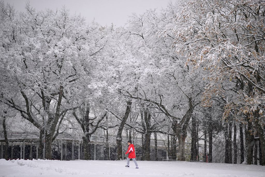 Havat kotor egy munkagép a hóesésben Debrecenben 2024. november 22-én.