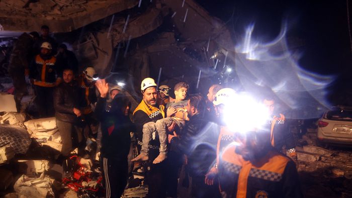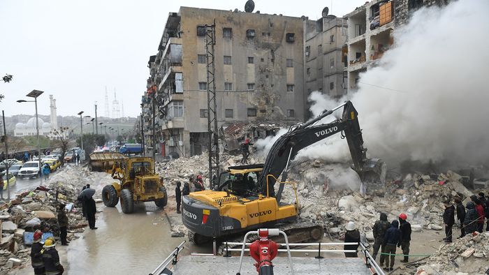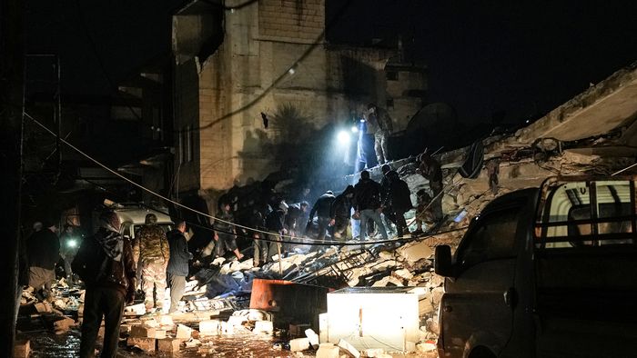 1/13A mentőegységek és civilek csoportja az épületek romjai közt túlélők után kutatnak.