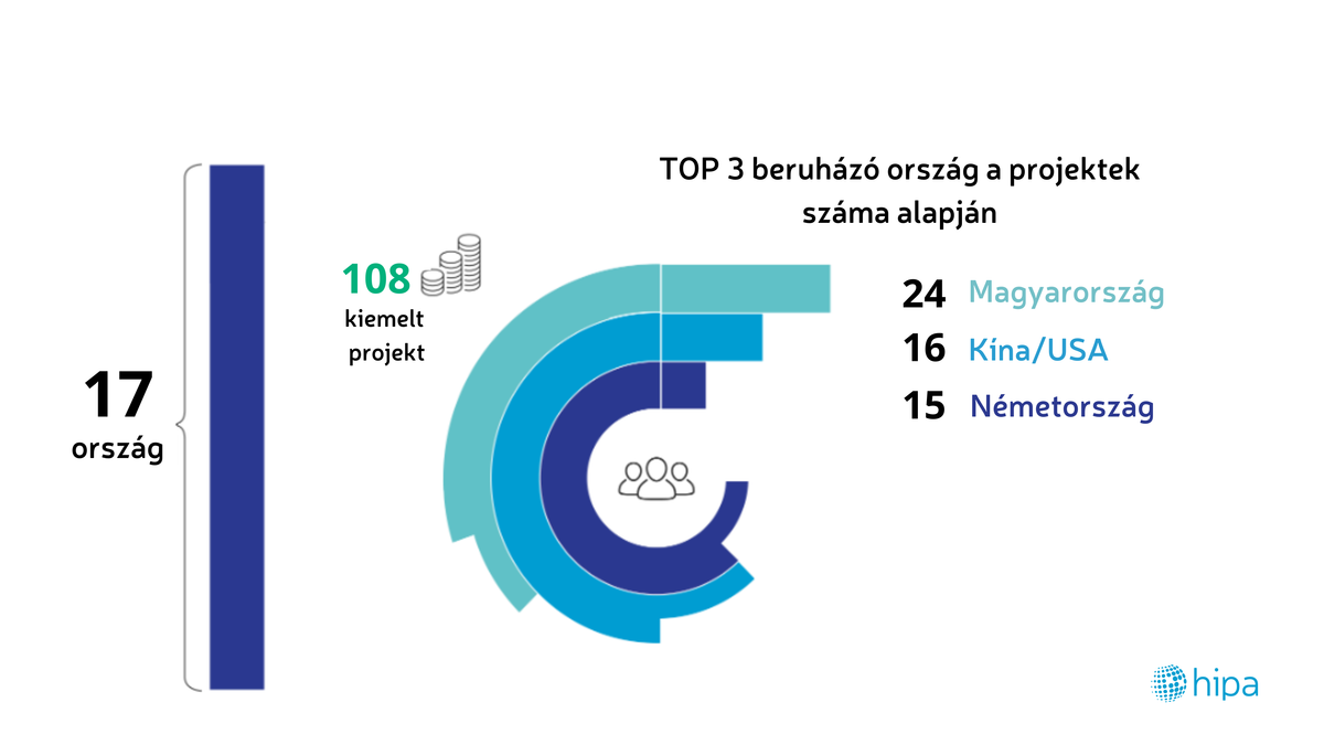 A hazai vállalatok projektjeivel együtt 17 országból érkeznek beruházások. A volumen alapján Kína, Szingapúr, Magyarország, az Egyesült Államok és Dél-Korea áll az első öt helyen, míg a projektek darabszáma alapján Magyarország, Kína, Németország, az Egyesült Államok és Franciaország a sorrend.