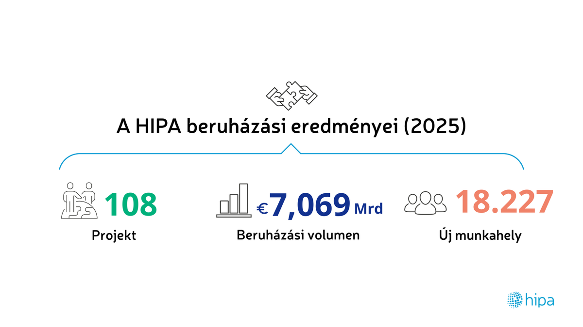 A befektetési volument és a munkahelyteremtést tekintve 2025 a HIPA történetének harmadik legjobb éve, a projektek száma pedig történelmi csúcsra emelkedett. A szervezet tevékenysége révén 108 befektetési projekt valósul meg Magyarországon 7,069 milliárd euró, azaz mintegy 2700 milliárd forint értékben, és létrejön 18 227 új munkahely.