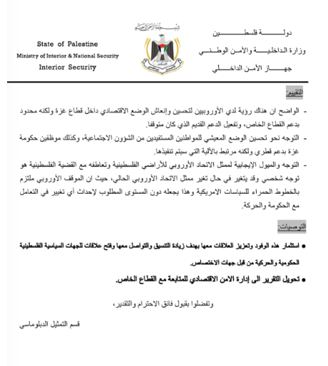 A most feltárt dokumentum azt javasolja: erősítsék az együttműködést és a kommunikációt az EU és a „palesztin politikai, kormányzati és [Hamász] mozgalmi szereplők” között.