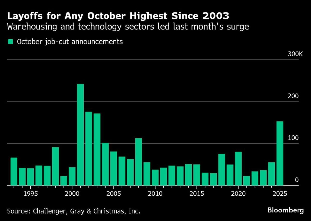 Az amerikai vállalatok múlt hónapban 153 074 elbocsátást jelentettek be, ami majdnem háromszorosa az előző év azonos időszakában mértnek, és főként a technológiai és raktározási szektor hajtotta. Ez a legtöbb októberi elbocsátás 2003 óta – mondta a Bloombergnek Andy Challenger, a cég bevételi igazgatója –, amikor a mobiltelefonok megjelenése hasonló hatású volt.