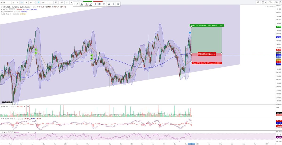 Technikai értelemben a risk/reward ráta 3 feletti értéke nem rossz üzenet, bár a 200 napos átlag nem mozog túl meredek trendben, mégis inkább long irányú pozicionáltságot láthatunk a technikai képen. Az RSI és az MACD inkább semleges, azonban a fundamentumok, a fair érték és osztalékhozam stabil támaszt jelentenek. A nemzetközi szektortársak között olcsónak számít a részvény.