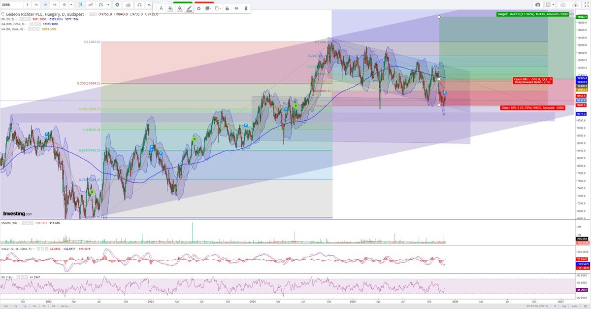 A Richter részvényárfolyama 9735 forint, közel van az 52 hetes mélyponthoz (9500 forint), miközben messze a 200 napos mozgóátlag (10 132 forint) alatt tartózkodik – a technikai indikátorok többsége (rövid és hosszú távon is) eladást jelez.