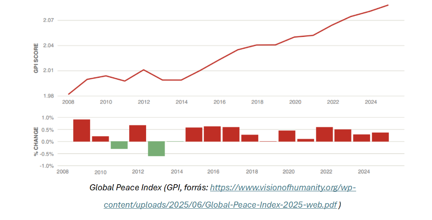 A globális konfliktusokat tükröző Gobal Peace Index (GPI) soha nem látott magasságban van, az éves riportban pedig az is olvasható, hogy a második világháború óta most van a legtöbb fegyveres konfliktus – összesen 59 –, amelyben legalább egy ország kormánya is aktív résztvevő egy másik ország, vagy fegyveres csoport ellen.