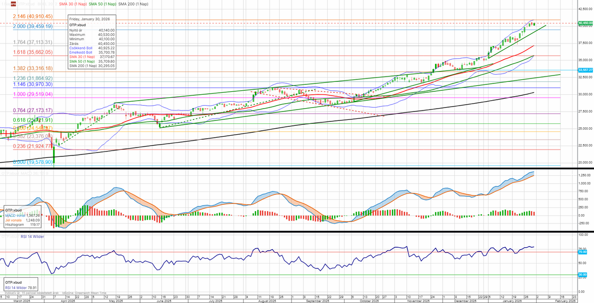 Az OTP árfolyama újabb ellenállási szintet lépett át 39 460 forintnál, mely így már fontos támaszt képez. Az emelkedés dinamikája lassult az elmúlt napokban, de továbbra is meredek emelkedő trendvonal mentén mozog a jegyzés. A következő fontos potenciális ellenállás 40 910 forintnál lehet. Fordulós jelzést a felső zöld emelkedő trendvonal szignifikáns letörése adna.