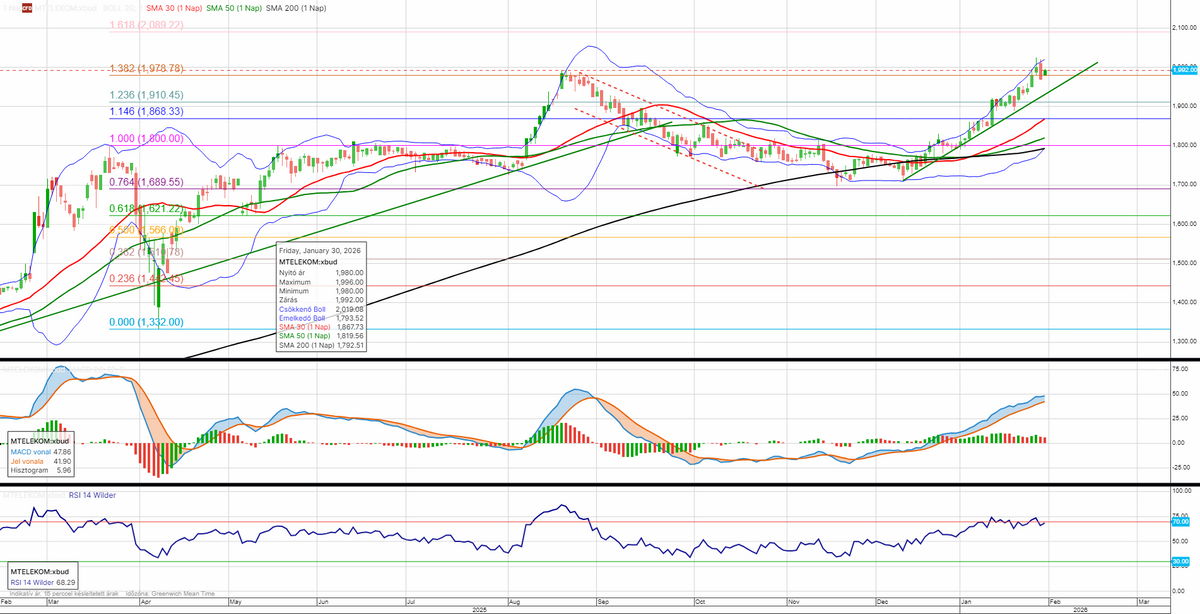 A Magyar Telekom árfolyama is újabb ellenállást tört át 1979 forintnál, majd vissza is tesztelte. Amennyiben felette tud stabilizálódni, folytatódhat az emelkedés. A nemrég kijelölt történelmi csúcs 2025 forintnál húzódik, felette pedig 2089 forintnál látszik a következő potenciális ellenállás.