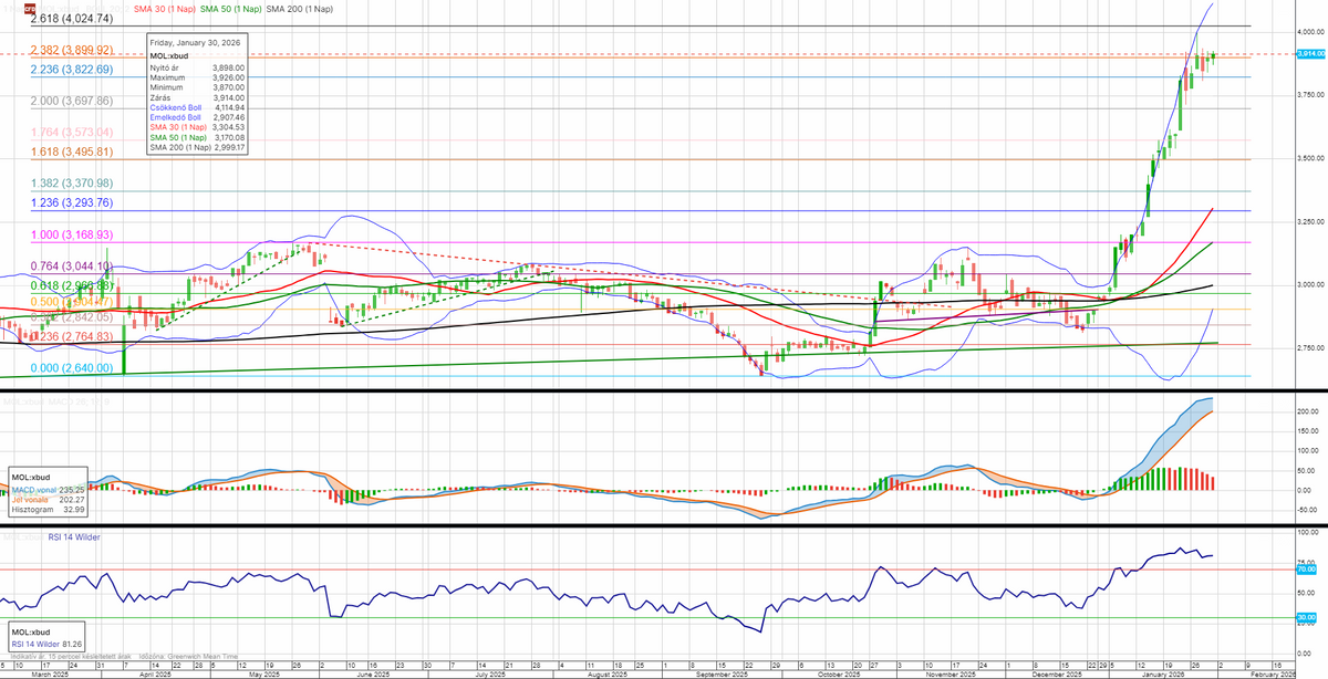 A korábbi lendületes emelkedést követően megtorpant a Mol emelkedése, de jelenleg is egy fontos ellenállás felett mozog, mely 3900 forintnál húzódik. Amennyiben szignifikáns lesz az áttörése, a következő akadály 4025 forintra tehető. Az RSI indikátor továbbra is extrém túlvettséget mutat, de egyelőre nem látható érdemi fordulatra utaló jelzés a grafikonon.