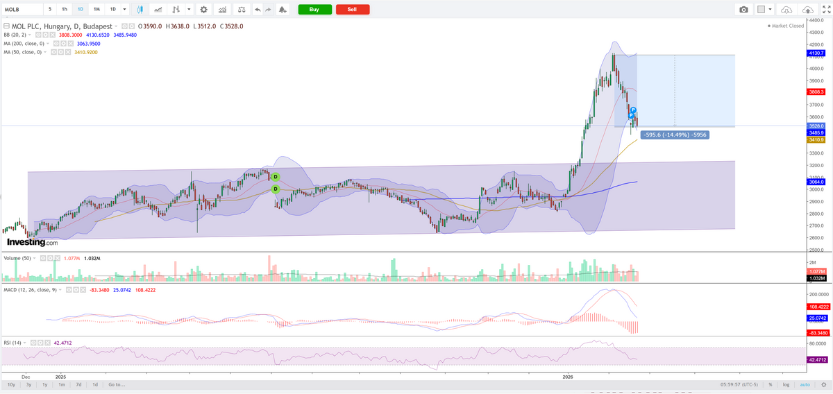 A Mol közel 30 százalékos év eleji emelkedést követően technikai értelemben túlvetté vált, majd korrekcióba fordult. A 3600 forintos szint rövid távú döntési pont, megtartása esetén 3660, majd 3830 forintig tartó visszapattanás jöhet, míg letörése a 3400–3130 közötti zóna felé nyithat teret. A fundamentális háttér rövid távon a hírekre érzékeny lehet, különösen az ellátási és finomítói marzsokkal kapcsolatos hírek lehetnek meghatározó befolyással. A technikai kép inkább egészséges korrekciót jelez egy emelkedő trendben, semmint trendfordulót, de a következő napok forgalmi szerkezete kulcsfontosságú lesz.