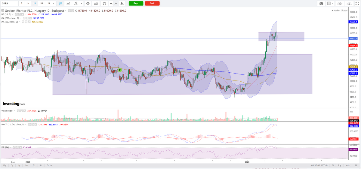A Richter árfolyama a február eleji felpattanást követően pihenőt vett. Az MACD indikátor eladási jelzés közelében jár, ami rövid távon oldalazó vagy enyhén csökkenő pályát valószínűsít. A 11 600 forintos támasz alatti zárás lefelé nyithat teret, míg a 11 820 forint feletti kitörés esetén visszatérhet a pozitív technikai folytatás. Ha a dollár erősödése vagy a forint erővesztése megtörténik, akkor a gyógyszergyári részvény számára egyértelműen a további emelkedésnek lehet tere. A gyógyszerszektor nemzetközi szinten defenzív jellegű maradhat, de a hazai papír esetében egyelőre nem látható erős katalizátor. A következő két hét inkább a konszolidációról, semmint az impulzív mozgásról szólhat.