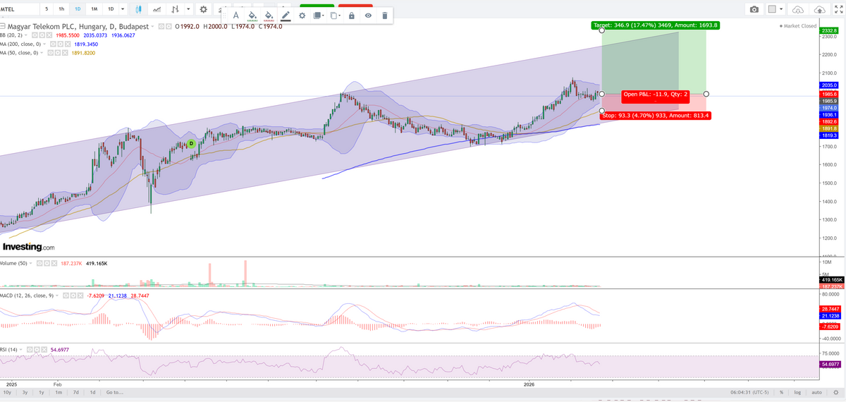 A Magyar Telekom esetében a többhetes emelkedő trend szintén pihenőpályán van, ugyanakkor egy nagyon erős „cap and handle” alakzat jelent meg, ami rendkívül lassan alakul ki, de ha megjelenik, akkor nagy valószínűséggel további emelkedést jelez előre. Az MACD-szerkezet inkább oldalazó jellegű, mint éles trendforduló. Ha a piac nem fordul erőteljes risk-off irányba, a papír stabilizálódhat a jelenlegi sávban. Az 1994 forint feletti kitörés újra megnyitná az utat 2075 forint feletti magasságokba, míg az 1896-os szint alatt technikailag mélyebb visszahúzódás következhet.