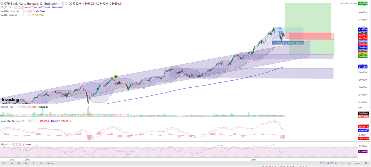 Az OTP Bank árfolyama az európai bankszektor korrekciójához igazodva visszahúzódott, új ellenállási szintet kialakítva 42 ezer forintnál. Innen visszahúzódva a 39–40 ezer forintos szint egy rövid távú támasz, ennek esetleges elejtése egyértelműen megnyitja a teret a további lefelé irányuló mozgásnak, míg tartós letörés esetén 37 700 forint irányába gyorsulhat a korrekció. Azonban még az ilyen mértékű esés is benne maradna a hosszú távú emelkedő trendcsatornában, ami a 200 napos mozgóátlag fölött van kétezer forinttal. A következő két hétben az árfolyam érzékeny maradhat a bankszektor hangulatára és a kamatpályára. Ha az MNB döntése nem okoz forintgyengülési sokkot, a jelenlegi szintek technikai értelemben inkább konszolidációs zónának tekinthetők, mint trendfordulónak, hiszen mind a 200, mind az 50 napos átlag a trendben marad. Ugyanakkor az OTP március eleji eredménykommunikációja növeli az eseménykockázatot, így a volatilitás emelkedése valószínű.