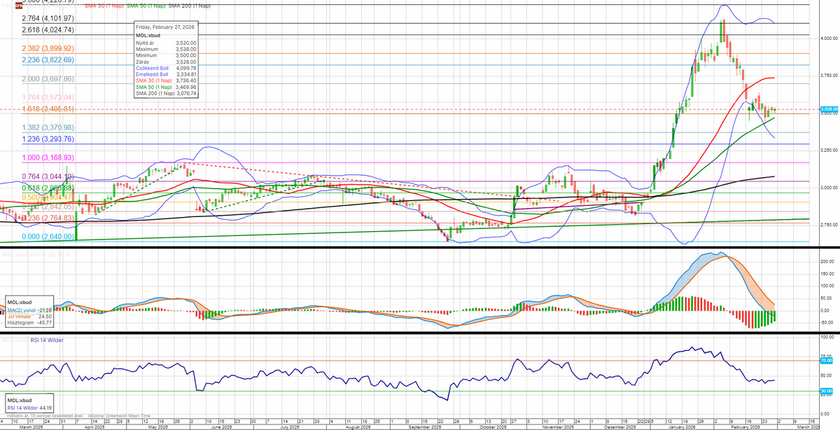 A Mol jegyzése a 3500 forintos támasz közelében pihen, még nem múlt el a letörés veszélye. Nem sokkal alatta az 50 napos mozgóátlag 3470 forintnál, majd 3371 forintnál a 138,2 százalékos Fibo-szint képez újabb támaszokat. Felfelé irányuló korrekció esetén 3573 forintnál húzódik az első fontosabb ellenállási szint.