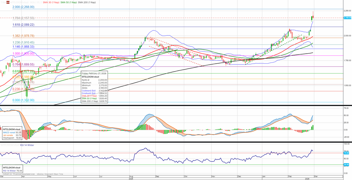 Jelentőset ugrott a Magyar Telekom árfolyama a negyedéves jelentés közzétételét követően, elsősorban az osztalék- és részvény-visszavásárlási politika miatt. Rövid távú támasz alakult ki 2157 forintnál, ugyanakkor az árfolyam kilépett a Bollinger-szalagok közül, ahová hamarosan visszatérhet, illetve az RSI is erős túlvettséget mutat.