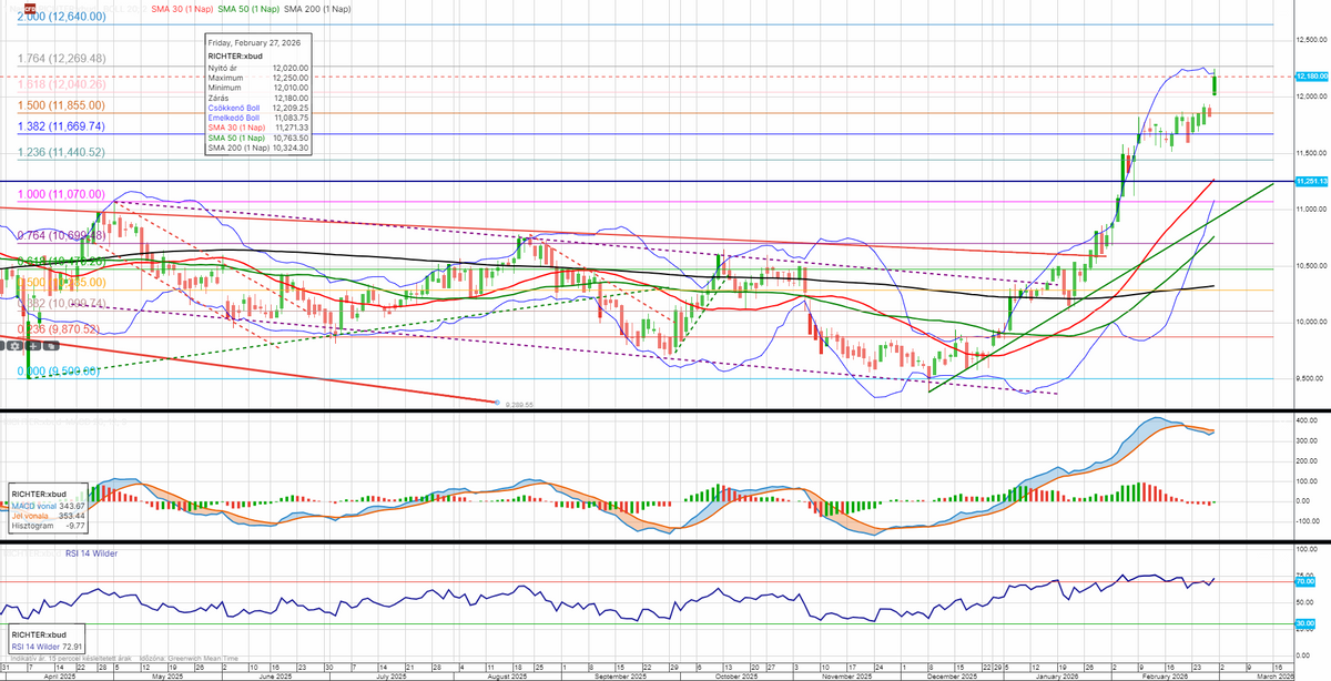 A Richter negyedéves eredményei minden soron meghaladták az előzetes várakozásokat, ennek hatására réssel ugrott felfelé az árfolyam. A következő potenciális ellenállás 12 270 forintnál húzódik, amelyet a 12 640 forintos szint követ, míg a korábbi ellenállás már fontos támaszt jelent 11 855 forintnál. Az RSI-indikátor így ismét a túlvett zónába került.