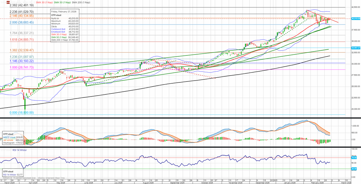 Az OTP árfolyama meghatározó ellenállási zónához ért, amely 39 850 és 40 135 forint között húzódik, a 30 napos mozgóátlag, egy rövid távú csökkenő trendvonal, illetve a 214,6 százalékos Fibo-szint.
