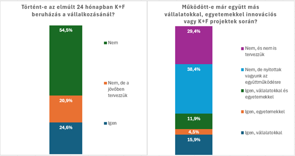 A Magyar Gazdaságfejlesztési Ügynökség Gazdaságelemzési Központjának (MGFÜ GEK) 2025 májusában, a kkv-k körében végzett kérdőíves felmérése szerint a magyar kkv-k háromnegyedénél nem történt k+f-beruházás az elmúlt két évben. Ugyanakkor az együttműködések terén jóval aktívabbak: a megkérdezett vállalatok közel egyharmada már részt vett vállalatokkal és/vagy egyetemekkel közös k+f-projektekben. Azok közül pedig, akik még nem vettek részt ilyenben, sokan nyitottak az együttműködésekre (lásd 4. ábra). A megkérdezett vállalatok többsége – több mint fele – a pénzügyi források hiányát jelölte meg az új ötletek megvalósításának, az innováció legfőbb akadályaként.