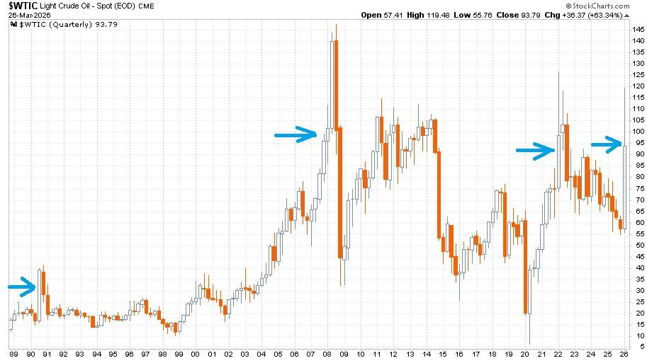 A négy ilyen hirtelen érkező és szignifikáns áremelkedést jól mutatja az 1989. január 1. és 2026. március 26. közötti időhorizonton a spot WTI-kőolajárra vonatkozó, negyedéves gyertyákkal megrajzolt grafikon.