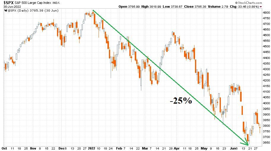 Itt is zöld nyíl mutatja a januári ATH és a júniusi lokális mélypont közötti, mintegy 25 százalékos esést, amelynek a kőolajáron túl a 2021-ben elhibázott monetáris politika gyors korrekciója is masszív kiváltó oka volt.