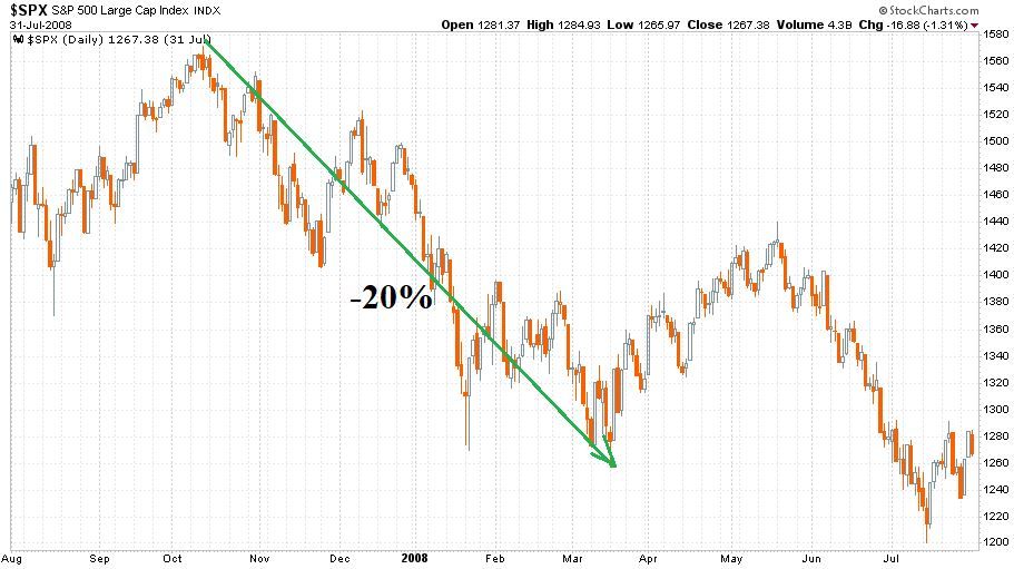 A 2007. októberi akkori csúcs és a 2008 márciusi „Bear Stearns” mélypont között (amit zöld nyíl mutat) itt is megvolt ugyanaz a 20 százalékos esés, mint 1990-ben. Ez az időhorizont azért is érdekes, mert ekkor még csak az első jelei voltak meg a pénzügyi válságnak, amely később jóval nagyobb bezuhanáshoz vezetett.