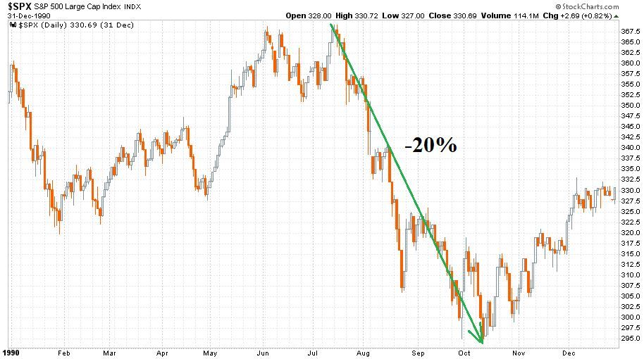 Ehhez először nézzük vissza a megelőző három hasonló esetet. Az 1990-es év nyarán Irak megtámadta Kuvaitot, ami a július eleji 16 dollárról három hónap alatt 41 dollárra lőtte fel a spot WTI-kőolaj árát. Ez a kőolajársokk szinte teljesen párhuzamos módon hatva komoly lejtmenetet idézett elő a részvénypiacon. A következő ábrán az S&P 500 index 1990-es éve látható napi gyertyákkal. Zöld nyíl mutatja a két és félszerező olajár mellett lezajlott, mintegy 20 százalékos indexesést.